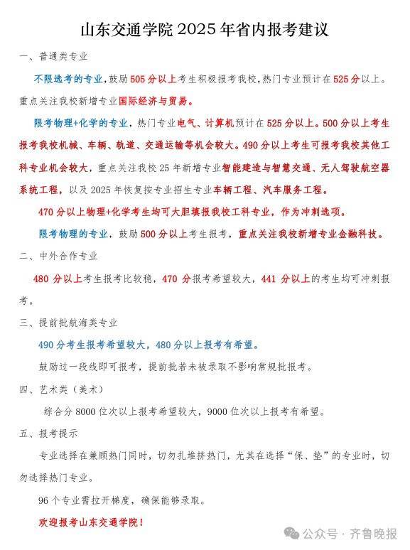 6月25日下午,山东交通学院发布2025年省内报考建议。记者了解到,该校鼓励505分以上考生积极报考不限选考的专业,热门专业预计在525分以上。可重点关注新增的国际经济与贸易专业。