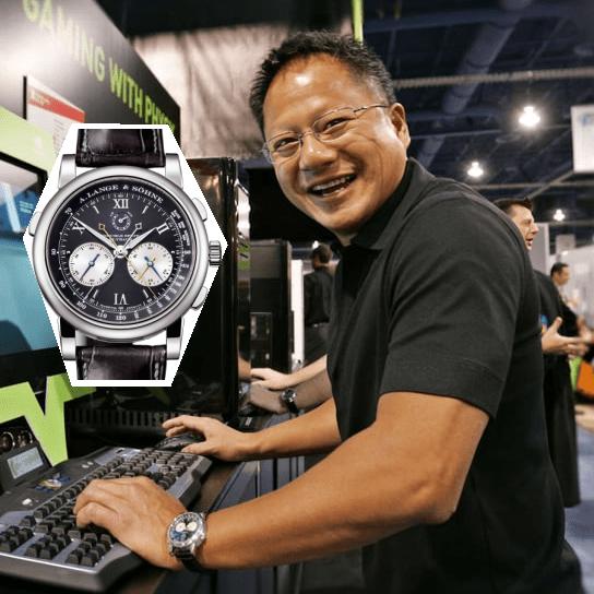 毕竟还没变身皮衣大黄时的他,一块黑盘朗格 Double Split Chronograph 就已经戴到飞起,还是已停产的款式。此处还有一个华点:难道在黄仁勋的世界里,腕表和皮衣不能共存?