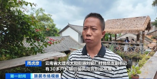 云南省大理市太和街道刘官厂村党总支副书记周虎彦:目前,产业发展已有30多户长期驻留凤阳邑(村)创业发展,带动了全村村民年收入增至现在的75万元。