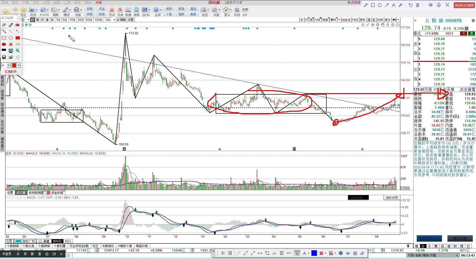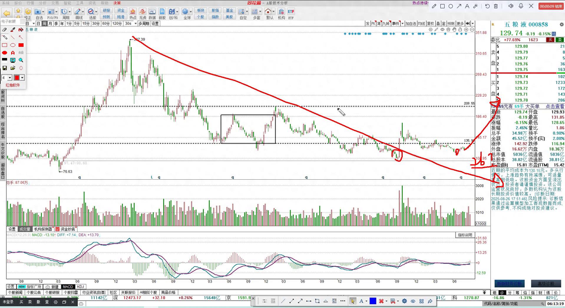 所以五粮液目前整体的走势是完好的。现在简单一点,目标点位就先看一百三十四到一百三十四再说,没到之前先只看少动。这是五粮液,简单说两句,如果觉得有用翻翻配资,看我点个赞。