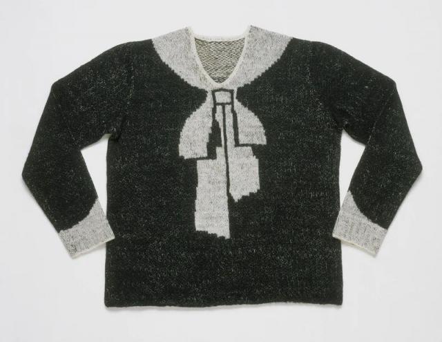 毛衣利用视觉错位,让人误以为蝴蝶结是真实地系在脖子上的。现在看可能觉得"就这?",但在20年代,这简直是破天荒的设计,相当于"还在古典油画时代的时尚圈,突然玩起了3D立体画"。▼