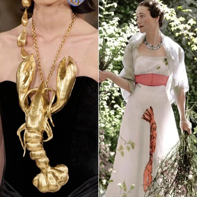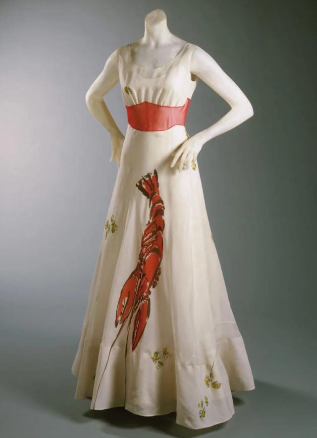 这条裙子的大胆之处在于,龙虾在西方文化中隐喻情欲(达利原画就有这层含义),在1937年,敢穿它的人,摆明了要和"端庄贵妇"划清界限。有人说,当别人还在绣小花时,她已经用龙虾裙对着男权社会竖中指了。▼