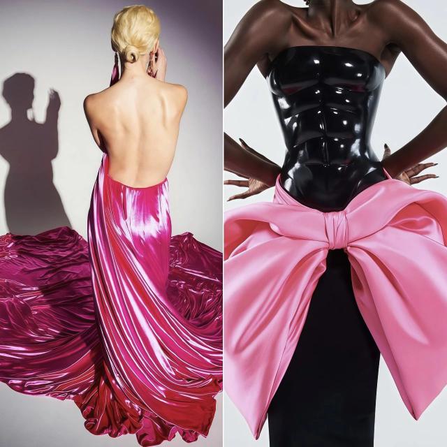 还有圣罗兰80年代这条粉色蝴蝶结礼服(右);在1947年,夏帕设计的礼服(左)上也有在后腰处加入粉色蝴蝶结的设计。▼