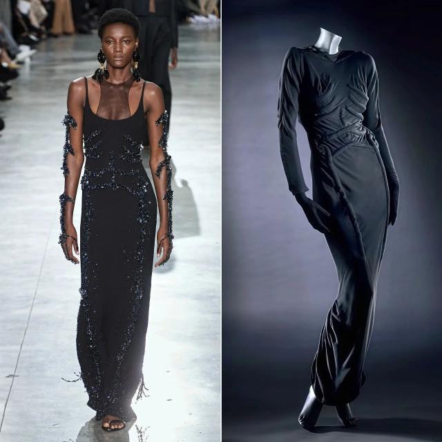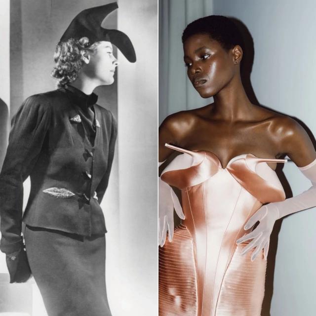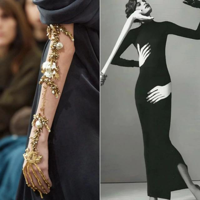 直观感受下,左边是现任总监Daniel的设计,右边是创始人Elsa Schiaparelli 100年前的设计,手掌元素、龙虾元素、骨骼裙。▼