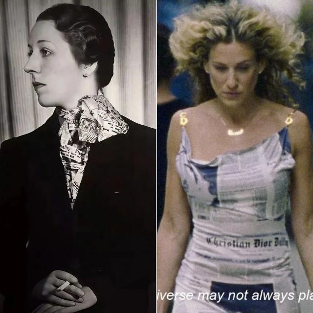 海盗爷设计的这款Dior报纸印花裙,在《欲望都市》里由Carrie上身,"老读者"应该都很眼熟。▼
