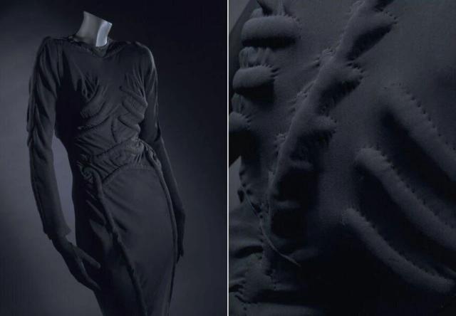 还有这件绗缝工艺做成的骷髅裙,被MoMA艺术馆永久收藏,策展人Michelle Millar Fisher强调这是"达利画笔与剪刀的完美合谋"。▼