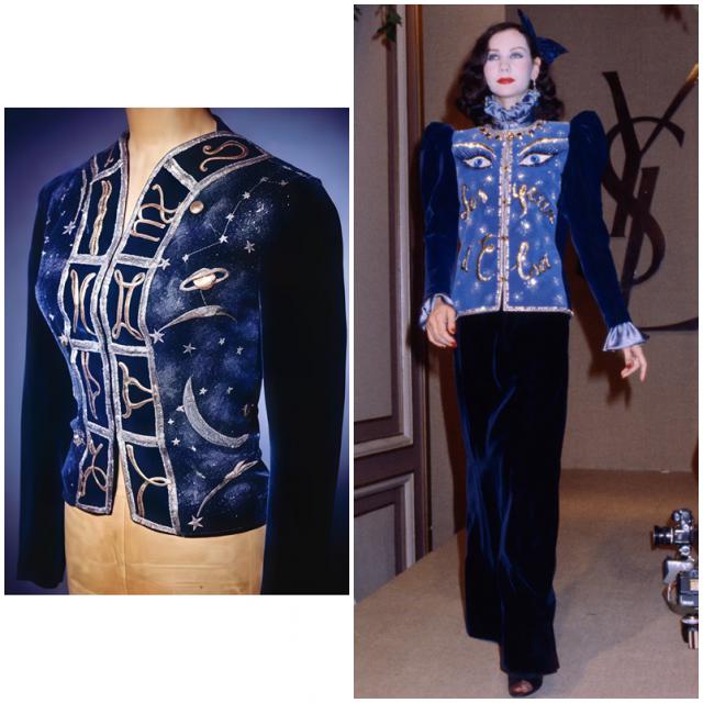 在上世纪末,圣罗兰也专门致敬过夏帕设计的外套——就是右图这件蓝色丝绒夹克,绣着路易·阿拉贡的诗名《Elsa的眼睛》。这里面有几个小细节:一方面眼睛本来就是夏帕的爱用元素,另一方面,刺绣夹克也是夏帕代表作之一,衣服上的"Elsa"刺绣既是诗中人名,又暗指她本尊。